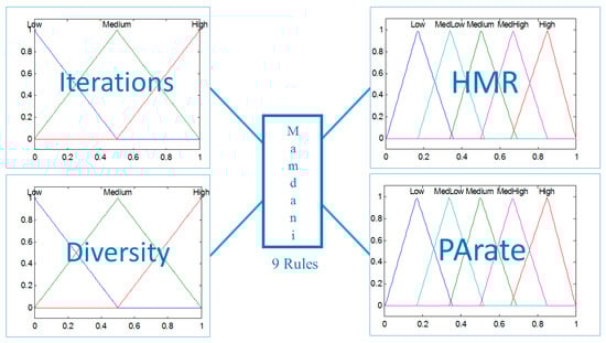 Specifically, the HMR and PArate parameters are adapted, as shown in Figure 14. The metrics for the input parameters of the fuzzy system are “iterations” and “diversity”, which are based on Equations (4) and (5):