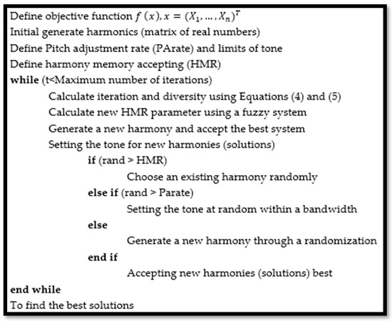 Figure 16 illustrates the pseudocode of the modified FHS with parameter adaptation. The main difference with respect to Figure 15 can be found in calculate the iteration and diversity values and to find the new HMR and PArate parameters through of the fuzzy logic system.