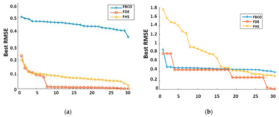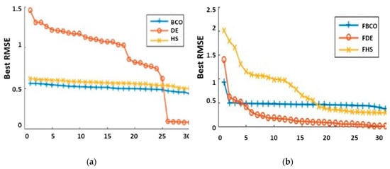 Once the experiments in Section 5 are shown, we analyzed the following results; for the first problems studied for the water tank, Figure 11 (part A) shows that for the original and fuzzy DE the lower errors are found in initial iterations, these results are reflected in Table 6, Table 8 and Table 10; the best results for the FBCO was 3.79 × 10−1, for the FDE was 4.82 × 10−2, and for FHS was 4.86 × 10−1, the results are similar but, a significant difference is shown with FDE. Otherwise, when noise is added in the model the DE continues to have lower errors (see Figure 13 part A), the best in FBCO was 3.80 × 10−1, for FDE was 1.27 × 10−3 and for FHS was 2.53 × 10−2.