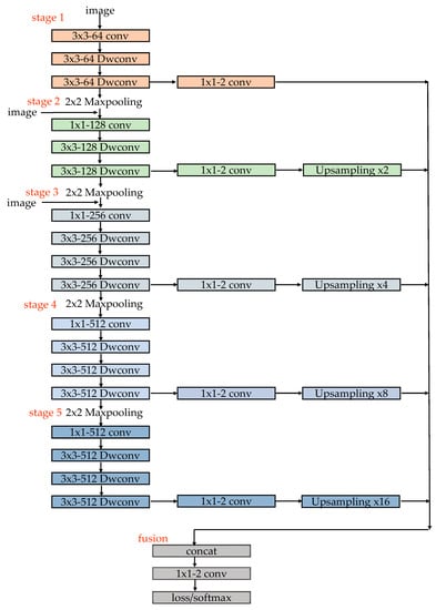 Specific structure and parameters of our multi-scale feature fusion network. Its convolution layers are divided into five stages, in which a maxpooling layer is connected after each stage. Feature maps of each stage are connected to a conv layer with kernel size 1 × 1 and channel depth 2 and then upsampled to original image. Finally, a weighted cross-entropy loss/softmax layer is followed to get the output.