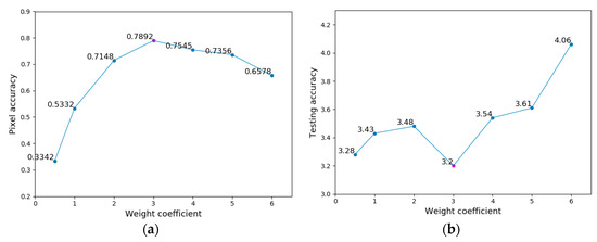 The performance on the test dataset with different weight coefficients. (a,b) represent the influence of weight coefficients on pixel accuracy and testing accuracy, respectively.