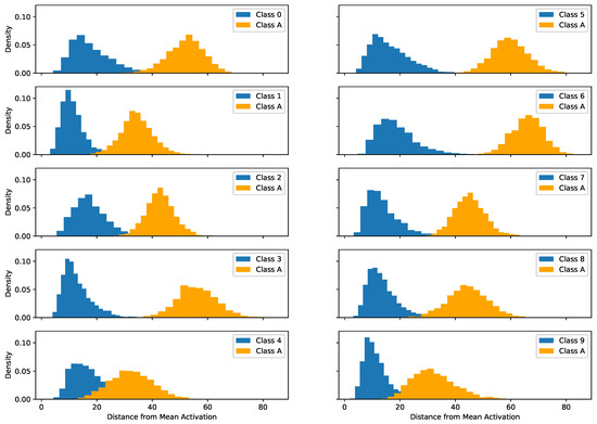 By measuring the Euclidean distance between each activation logit from a new class, and the mean activation from each training class, we can infer how similarity can impact the misclassification of a sample. In Figure 4, we compare the distances between the uppercase A character and each number character from the dataset. This character typically gets misclassified with the number 4, and its distance distribution intersects with a large part of the activation distances from the training set. Still, a large chunk of the set is further than the maximum tail of class 4, and thus, those examples have a higher probability of being rejected and reclassified as a new class.