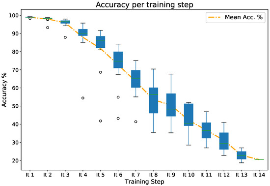 As a base metric, the obtained accuracy for our classifier when evaluating the complete dataset was 87.71% on EMNIST; this result is similar to state of the art on this particular subset (Performance results of different Deep Learning techniques for the MNIST dataset can be found in https://benchmarks.ai/mnist, in [46] the authors reports the performance for the EMNIST dataset). While training the generated set, the accuracy of each training iteration lowered in a constant decay per training step of around 9.27 ± 0.75%. When trained to add a small subset of the original data to the generated samples, the decay rate in each training step is cut almost in half, as shown in Table 1. This decay can be explained as a gradual interference effect to do with how information is learned within the model, and related to the model’s plasticity when learning new features of the newer classes. As a comparison, we trained the same model with generated samples and an additional 10% of randomly sampled original training data, to test performance in pseudorehearsal training.