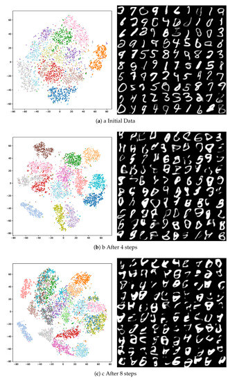 t-SNE visualization of distribution space with generated samples for the starting classes (a), after 4 steps (b) and after 8 training steps (c). Each color represents a class.