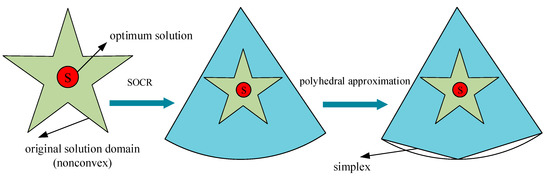 At first, Equation (15) is rewritten as Equation (16). And Equation (17) is applied to relax Equation (16) to a polyhedral space.