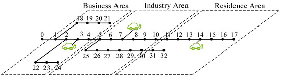 The case uses an IEEE 33-bus system [25], and the urban area is divided into residential area, commercial area, and industry area [26]. The total load is 3715 kVA and there are three types of EVs in the distribution network. The structure of the distribution network and the location of the charging station are shown in Figure 3 and the electricity price of DSO is shown in Figure 4. The data of electric vehicles can be obtained in [20]. The battery capacity of EVs is assumed to be 42 kWh, and the initial state of charge (SOC) is 30%. There are 60 charging piles in the CS and the maximum charging power of each charging pile is 30 kW. In order to simplify the problem, this paper assumes that there are three types of EVs in distribution network and their parking time is shown in Figure 5. Additionally, the number of three types of electric vehicles is 200, 150, and 50 respectively. All simulations are implemented on a laptop with Intel® Core(TM) i5-7300HQ CPU@2.5 GHz, 8 GB memory, and the algorithms are compiled by MATLAB. YALMIP tools [23] are used to model and CPLEX [27] is called to solve the MILP model by branch and bound method. Branch and bound method is a common method, whose process only briefly described in this article can be seen in [28].