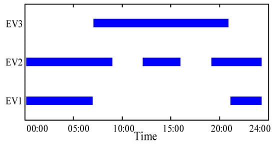 In charging mode optimization problem of EVs, the objective function of EVs is shown in Equation (5) and the constraints are shown in Equation (6), including power demand equation constraints, maximum charging power constraints, and available charging time constraints. The variables in this problem are and the purpose of this problem is to minimize the charging cost of EVs [18].
