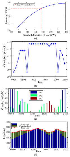 The Pareto front obtained is shown in Figure 6a, and an equilibrium solution is selected to show the results. As shown in Figure 6b, charging price is higher in the peak period and lower in the valley period, so as to guide electric vehicle users to charge in the valley period. However, charging prices are the same as in many periods of time, in order to avoid users concentrating on charging at the low price period, resulting in new load peaks. Under the guidance of charging price, the charging power of different electric vehicles is shown in Figure 6c. It can be seen that charging load is mainly concentrated in the night time and some electric vehicles charge in the afternoon, due to their parking characteristics. The load curve of distribution network after orderly charging of electric vehicles is shown in Figure 6d. Under the guidance of charging price, charging load mainly concentrates on the period of low power consumption, which greatly reduces the load fluctuation of the distribution network. It can be seen that the cooperative game between DSO and CSs can achieve win-win situation and maximize social welfare.