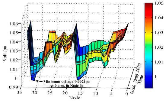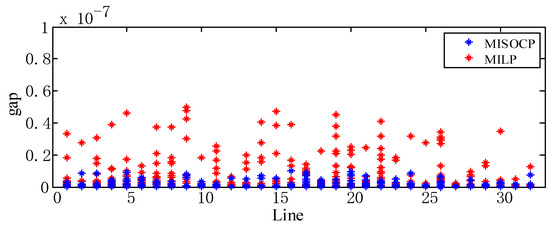 The voltage distribution in the distribution network is shown in Figure 7. It can be seen that the return mapping algorithm can correctly restore the original variables. At the same time, the minimum voltage of distribution network is 0.9921 pu, which occurs at 9 a.m. on bus 31. The minimum operating voltage allowed in the distribution network is 0.93 pu. In other words, the voltage security of the distribution network can be guaranteed under the scheduling strategy in this paper. As shown in Figure 8, the relaxation error of MILP is larger than that of MISOCP but both are less than 10−7. Compared with the numerical value of decision variables, this part of the error can be neglected. It can be seen that the second order cone relaxation has high accuracy. At the same time, polyhedral approximation will not greatly reduce the accuracy of the model.