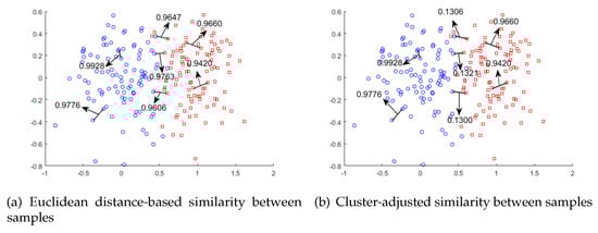 Comparisons between two types of similarities between samples, shown as (a) and (b). The clustering-adjusted similarity clearly tunes down the Euclidean-based similarity between two instances from different clusters.