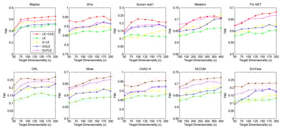 Results of FMI on ten datasets (Msplice, W1a, Soccer-sub1, Medelon, FG-NET, ORL, Musk, CNAE-9, SECOM, DrivFace) under different target dimensionalities (c).