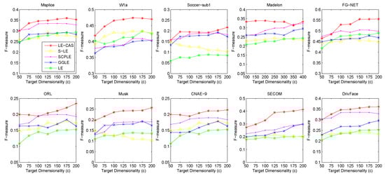Results of F-measure on ten datasets (Msplice, W1a, Soccer-sub1, Medelon, FG-NET, ORL, Musk, CNAE-9, SECOM, DrivFace) under different target dimensionalities (c).