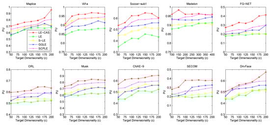 Results of PU on ten datasets (Msplice, W1a, Soccer-sub1, Medelon, FG-NET, ORL, Musk, CNAE-9, SECOM, DrivFace) under different target dimensionalities (c).