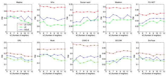 LE-CAS, LE, and GGLE make use of a kNN graph to set up the adjacency matrix and the weights between samples, and hence for graph-based dimensionality reduction. To study the sensitivity of these methods to the input value of , we increase from 5 to 12, and report the FMI values of these algorithms under each input value of (number of neighbors) in Figure 5.