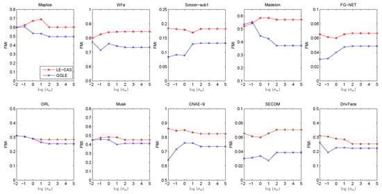 Both LE-CAS and GGLE specify edge weight by Gaussian heat kernel function. From Equation (11), we can see that they both rely on a suitable Gaussian heat kernel width . should not be too small or too large. If is too small, the similarity in Equation (11) will be close to 0, On the other hand, should not be too big. If is too big, the similarity in Equation (11) will be close to 1. In our previous experiments, we set as the mean of square Euclidean distance between all training instances for both LE-CAS and GGLE. To investigate the sensitivity of on LE-CAS and GGLE, we conduct experiments to investigate the influence of . In the following experiments, we increase from to for LE-CAS and GGLE. Other parameter settings are kept the same with previous experiments. Similarly, we run 30 independent experiments for each fixed and report the FMI under each in Figure 6.