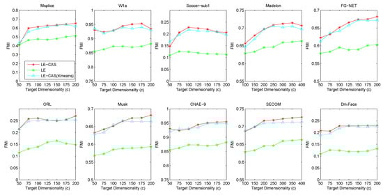 Figure 2 (for FMI’s performance), Figure 3 (for F-measure’s performance) and Figure 4 (for PU’s performance) show the results with respect to different fixed target dimensionality after applying different dimensionality reduction solutions and with the same k-means clustering. To avoid random effects, we repeated the experiment for 30 times and calculated the mean and variance of the results of LE-CAS and comparing methods with respect to four evaluation metrics on respective datasets, which is shown on Table 2.