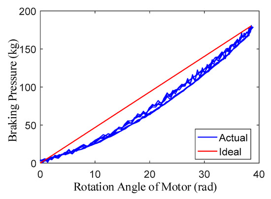 As seen from Equation (10), the relationship between the braking pressure and the rotation angle of motor is established by a linear function. However, the ideal EMA mathematical model ignored many nonlinear factors, such as the deformation of the gear and gear clearance. As described in the literature [25,26], the reduction gear will exhibit deformation under a heavy load which can eventually affect the relationship between the braking pressure and the motor position, rendering it different from the ideal model. After many experiments, the actual curves of the braking pressure and the motor position are drawn and the comparison of the ideal and actual curves is shown in Figure 2.