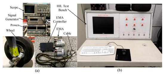 To verify the servo performance of the proposed control method, the signal generator is taken as the braking pressure reference signal source, and a scope is used to record the braking pressure signals. For practical purposes, the EMA is installed in the aircraft wheel as shown in Figure 4a, and the HIL test bench is shown in Figure 4b.