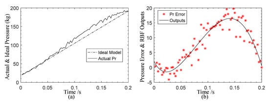 Then, the approximate performance of the designed RBF neural networks is verified by real-time experiments. As the neural networks proposed in this paper is used to approximate the unknown functions in the EMA model, we took a set of actual braking pressure data to verify it. The braking pressure ranges from 20 kg to 190 kg, the actual braking pressure and the ideal braking pressure are as shown in Figure 5a. It can be found that there are some differences between the actual pressure and the ideal model, due to the nonlinear factors such as the gear deformation. So, the proposed neural networks are used to approximate the unknown functions in the EMA model and its approximate performance of the braking pressure error is shown in Figure 5b. The experiments results indicate that the neural networks can approximate the braking pressure error effectively. This is also the basis of the high-performance pressure control.