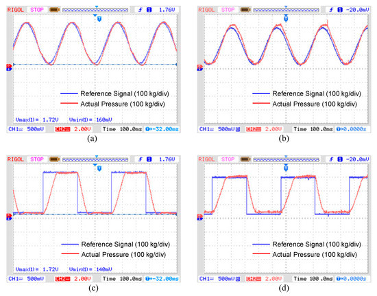 Figure 6a,b shows that the frequency of the pressure signal is 3 Hz, the amplitude is 300 kg and the offset is 30 kg. It can be found that the proposed control algorithm in this paper has better tracking accuracy and smaller signal phase lag than the PID control algorithm. In Figure 6c,d, the reference signal is a square wave, which requires a more precise control algorithm. The frequency is 2 Hz, the amplitude is 300 kg, and the offset is 30 kg. Compared with the traditional PID control, the proposed method can increase the braking pressure much more quickly without overshot and the static error is much smaller than that in the PID control.