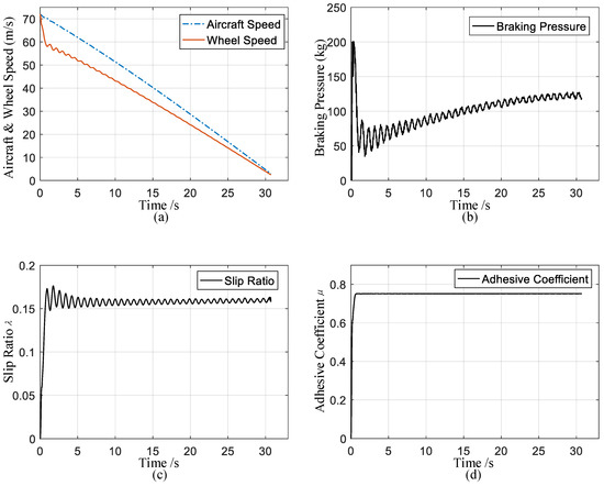 HIL experimental results. (a) Aircraft and wheel speed; (b) Braking pressure; (c) Slip ratio; (d) Adhesive coefficient between the wheel and the runway.