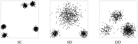The first experiment concerns the clustering of the three datasets of Figure 1: dataset Subcluster (SC) has five clusters, and four of them are subclusters forming two pairs of clusters, respectively; dataset Skewdistribution (SD) has three clusters with skewed dispersions; dataset Differentdensity (DD) has clusters with different densities. Each dataset is generated with 1000 points.