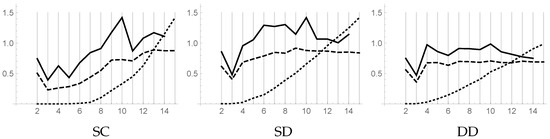 Plots versus k of DB (dashed line), DB** (solid line), and CL (dotted line) for SC, SD, and DD.
