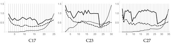 Plots versus k of DB (dashed line), DB** (solid line), and CL (dotted line) for C17, C23, and C27.