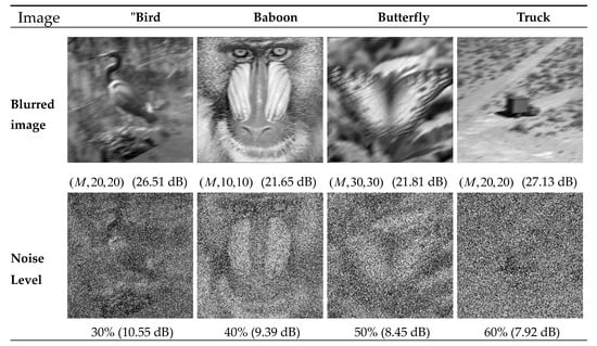 The blur kernels used in the test were Gaussian blur, average blur, and motion blur, all of which were generated by built-in functions of MATLAB. The function fspecial (‘gaussian’, ,) generates an Gaussian blur kernel standard deviation of , and the kernel is hereinafter referred to as for convenience; fspecial (‘average’, ) generates an average blur kernel, which is referred to as ; fspecial (‘motion’, ,) generates a motion blur kernel with a length of and angle of , which is referred to as . Noise effects were generated by built-in function imnoise (Ib, ‘salt & pepper’, level), where “Ib” is the blurred image and “level” is the noise density, i.e., the percentage of noise in the total number of pixels.