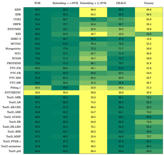 Average accuracy on the test set amongst the dummy classifier, GRALG, WJK and the proposed embedding technique. Results are given in percentage. The colour scale has been normalised row-wise (i.e., for each dataset) from yellow (lower values) towards green (higher values, preferred).