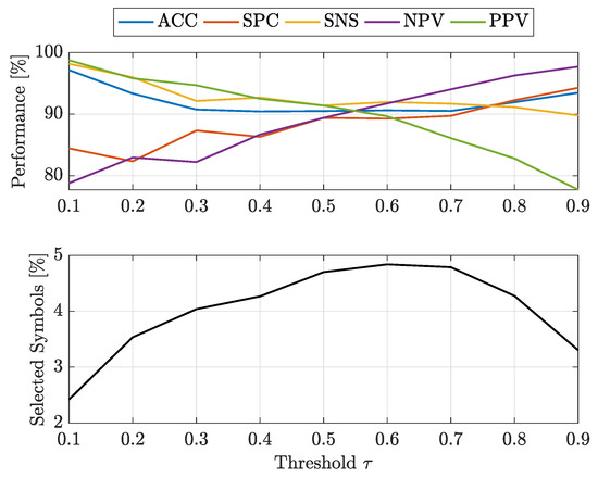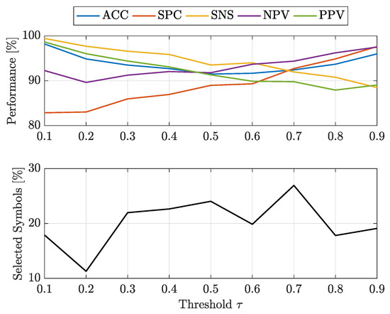 Table 2 and Table 3 show the results on the test set for -SVM and -SVM (respectively) with and in the fitness function (13): the former case does not foster any feature selection during training (classifiers can choose as many features as they like), whereas the latter equally optimises performances and sparsity in selecting symbols from the alphabet. The rationale behind using -SVMs alongside -SVMs, despite their poor performances on benchmark data, stems from Section 3; by looking at Table 1 it is clear that this is a properly-said high-dimensional problem (converse to benchmark datasets whose maximum number of features reaches 1500), so it is also worth trying linear methods alongside non-linear ones. Performances on the test set are presented via the following parameters: accuracy (ACC), specificity (SPC), sensitivity (SNS), negative predictive value (NPV) and positive predictive value (PPV), along with the sparsity, defined as percentage of non-zero elements in (or ); that is, the number of selected alphabet symbols over the entire alphabet size: the lower, the better.