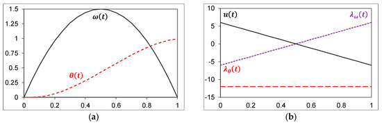 Figure 1. External states, co-states, and control for optimally controlled double integrator plant with time on the abscissa and values on the ordinate. (a) State trajectories, θ(t) and ω(t) from Equations (18)–(20). (b) Co-state trajectories in shadow space λ_θ (t), λ_ω (t), and control u(t) solutions to Equations (12)–(15), and (17).Integrating (14) - Rewrite the Hamiltonian Minimization Condition in Equation (8) by substituting Equation (9).