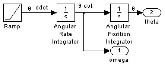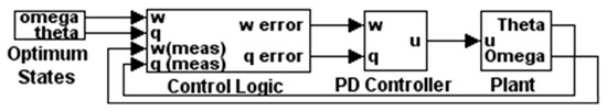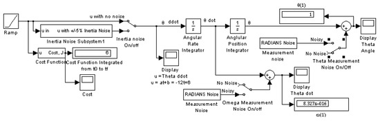 Notice in Figure 1 the behavior of the extremal states, co-states (in shadow space), and control in the figures below are limited to . Observe that the state θ is nonlinear in normal space, while the co-state is linear and sloped. Similarly, the state ω is nonlinear in normal space, while the co-state is linear and sloped. Additionally, notice the figure displayed in Figure 2 is provided in full form in the Appendix A. In addition to the simple double integrator implementation of the optimum control, there are subsystems to calculate the resultant cost as well as J and subsystems to display the data numerically and via plots. This format has been maintained throughout analysis of all the controllers considered in this study.