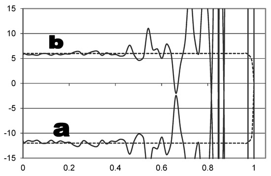 This matrix expression in Equation (24) can be solved in real-time as the simulation progresses in several ways. Two methods are depicted in Figure 3. There is a complication to continuously updating constants a and b. As time approaches the end time (t = 1), the [A] matrix becomes rank deficient, because the rows are linearly dependent. This will cause the computer program to become unstable. The integration constants in Figure 4 vary as time progresses. As t approaches , the values of the constants oscillate unstably to very large values. To account for this shrinking horizon prediction control problem, an optimum open loop controller is inserted and used at these times. We disregard the unstable values that come out of the continuous predictive control logic. Intuition: This should increase cost slightly from the optimum case.