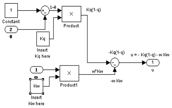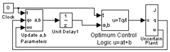 Equation (17) will be the enforced form of the control in subsequent derivations substantiating the novel paradigm contribution for each subsequent form. Using the initial conditions and the final conditions yields the values for constants: a = −12, b = 6, c = 0, and d = 0. Thus, the optimum open loop controller is Equation (21) implemented in SIMULINK, as depicted in Figure 2.