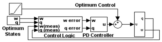 This controller feeds forward (where this topological variant justifies the use of the term “feedforward”) the time-parameterized optimal solution reparametrized as optimal states and then compares the optimum states to the current state to generate the error signal fed to the PD controller, as depicted in Figure 6. The states are taken from a double integrator with the optimum control calculated in Figure 7 corresponding to Equations (19) and (20), as the control logic input seen in Figure 8.