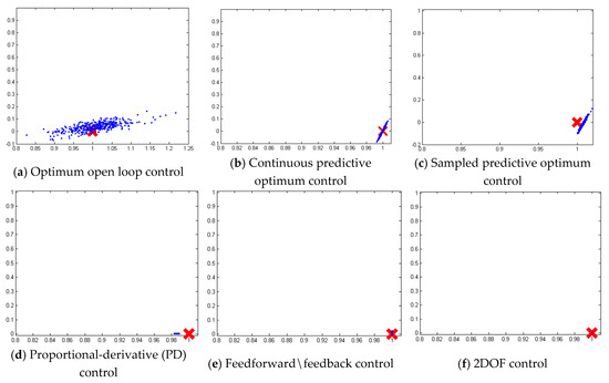 If the requirements on stated end conditions can be relaxed sufficiently to emphasize minimum cost, the tiers of results would change. The optimum open loop controller would join the first tier due to its minimum cost, but such a re-ranking will not be done in this case due to the large error achieving end conditions. The first tier would include the continuous and the sample optimum controllers. They achieved minimum cost while also closely meeting the end conditions. Next, the second tier would include feedback/feedforward and 2DOF PD controllers. They had slightly higher costs while very precisely meeting the stated end conditions. Third, the PD controller had very high cost, but also did a good job meeting the end conditions.