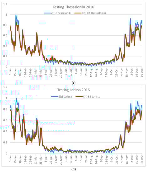 - Considering the ensemble forecasters, it could be seen from the obtained results that none of the two forecast combination methods had attained consistently better accuracies compared to each other, as far as the cities of Athens and Thessaloniki were concerned. Specifically, from Table 3, Table 4, Table 5 and Table 6, it was observed that the MAE and MSE values across the two combination methods were similar for the two cities; however, their errors were lower than those produced by each separate ensemble forecaster.