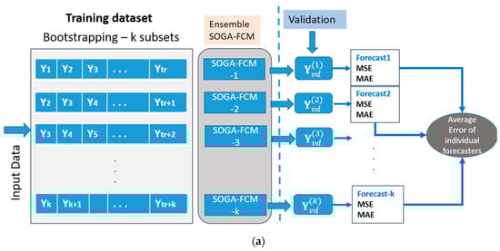 Step 2. (Resampling method/Bootstrapping). Let’s consider k sets as training sets from the whole dataset every time. For example, in the monthly forecasting, we excluded one month every time from the initial in-sample dataset, starting from the first month of the time series values, and proceeding with next month till k = 12, (i.e., this means that 1 to 12 months were excluded from the initial in-sample dataset). Therefore, k subsets of training data were created and used for training. The remaining values of the in-sample dataset were used for validation, whereas the testing set remained the same. Figure 2 shows an example of this bootstrapping method for the ensemble SOGA-FCM approach. In particular, Figure 2a represents the individual forecasters’ prediction values and their average error calculation, whereas, in Figure 2b, the proposed forecasting combination approach for SOGA-FCM is depicted for both ensemble methods.