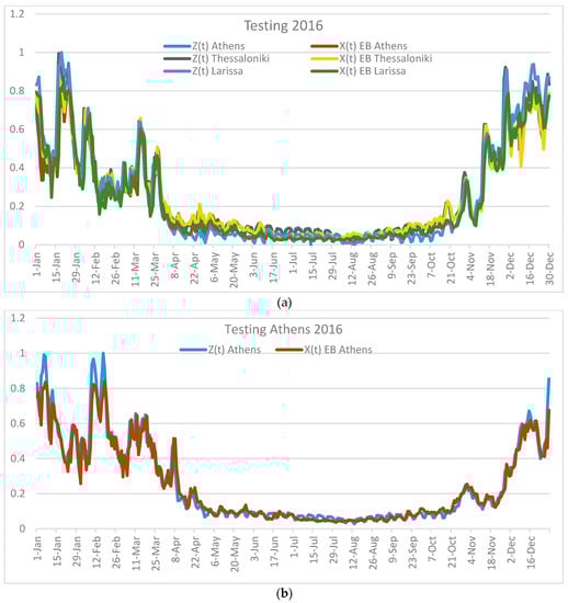 Each dataset was normalized to [0,1] before the forecasting models were applied. The normalized datasets were taking again their original values, while the testing phase was implemented. The data normalizations were carried out mathematically, as follows: