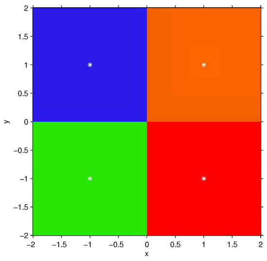 Since is a 2nd-degree polynomial system, the approximations of order equal or higher than 2 of Jacobian matrix are exact and the fixed point function of the CMNm and RMNm methods coincide with that of Newton’s method. In this case, , , and are superattracting fixed points and there are no strange fixed points or free critical points. Figure 2 shows the resulting dynamical plane, that coincides with that of Newton’s method.