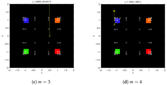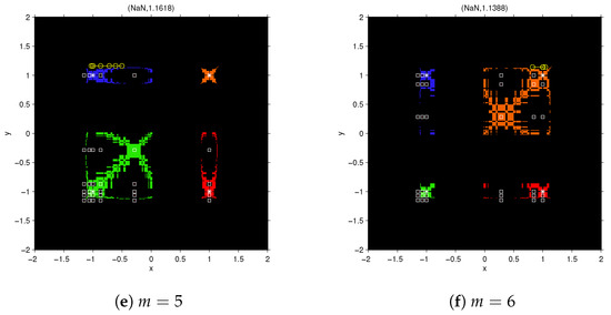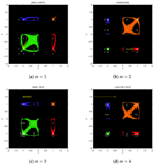Figure 1 shows the dynamical behavior of fixed point function for . These figures have been obtained by the routines described in [16]. To draw them, a mesh of points has been used, 200 was the maximum number of iterations involved and the tolerance used as stopping criterium. In this paper, we have used a white star to show the roots of the nonlinear polynomial system and a white square for the free critical points. Figure 1 shows that, as greater m is, the wideness of basins of attraction decreases, in spite of having a better approximation of the Jacobian matrix. The color assigned to each of the basin of attraction corresponds to one of the roots of the nonlinear system. The black area shows the no convergence in the maximum number of iterations, or divergence.