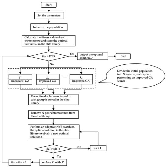 Step 4: Divide the initial population into N subordinate groups, (i = 1, 2, ..., N), and N is generally taken as . In each , genetic operations (selection, crossover, and mutation) are performed according to Section 4.3. Evaluate the fitness value of each individual in , save the best individual in each into the elite library, and replace the original N poor solutions of the elite library;