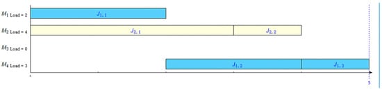 The number in the MA is the machine number. Each number indicates the machine number of the corresponding operation selected in the optional machine set. See Figure 2, where the first 1 in the figure indicates the processing machine number of the corresponding operation in the optional machine M = {, }, that is, . MA and OS have the same length, which is equal to the sum of the operations of all the jobs, that is, L, and the length of the chromosome is 2L. Table 1 is the processing schedule for the 2 × 4 problem, and Figure 3 is the Gantt chart for solving the problem.