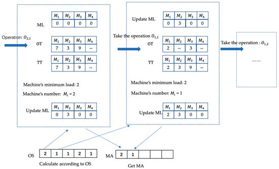 Each solution of FJSP consists of two parts []: one is to sort the operations assigned on the machine, that is, the operation sequence (OS); the other is to assign each operation to a machine set, that is, machine assignment (MA), which means that the algorithm assigns each operation to the corresponding machine and calculates its start time and end time. The number in the sequence OS is the operation index. The order in which each job j appears in the OS represents the processing order of each operation of the job. See the OS of the chromosome in Figure 2: 1 2 1 1 2. The first 1 represents the operation the job , the first 2 represents the first operation of the job , the second 1 represents the second operation of the job , and so on. The processing order of each operation of this chromosome is: