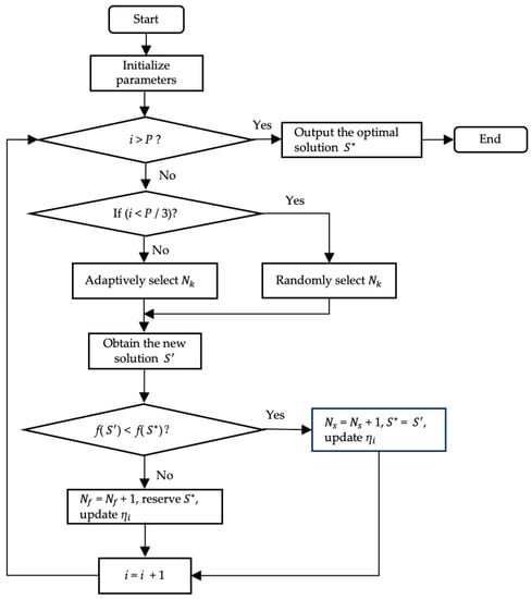 Different from the previous VNS using a fixed search order, this paper proposes an adaptive neighborhood selection strategy based on neighborhood search performance. The adaptive strategy is to learn the validity of each neighborhood search in the current optimization algorithm as the iteration proceeds. In order to promote effective competition between neighborhoods, the neighborhood method with a better search strategy has a higher probability to be used for the optimization of the algorithm. The steps of the adaptive neighborhood search algorithm are as follows and the flow chart is shown in Figure 5.