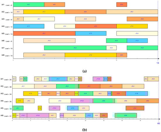 Gantt chart of the best heuristic solution: (a) is the 8 × 8 problem from Kacem; (b) is MK01 from BRdata.