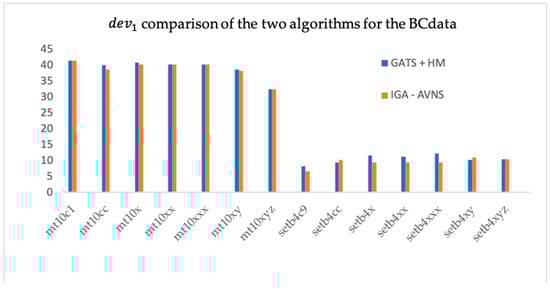 In Table 5, for the value of , the smaller the value, the closer to LB. For the value of , 0 indicates that the two algorithms get the same solution, a positive value indicates that the solution obtained by GATS + HM is better, and if the value is negative, the solution obtained by IGA-AVNS is better. It can be seen from these two sets of values that the two algorithms get the same solutions in 5 out of 12 instances, our IGA-AVNS outperforms the GATS + HM in 7 out of 12 instances, and the GATS + HM only obtains 2 out of 14 better solutions than our IGA-AVNS algorithm. Figure 7 shows the comparison of obtained by the two algorithms when solving the BCdata. We can conclude that IGA-AVNS is better than the GATS + HM algorithm in most cases when solving the BCdata. Therefore, the feasibility and effectiveness of the IGA-AVNS algorithm for solving the FJSP are further proved.