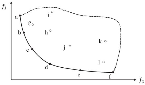 Generally, a set of trade-offs can be obtained for MOO problems, so the most important task in solving a MOO problem is to find a collection of Pareto optimal solutions as close to the true Pareto set as possible []. As shown in Figure 1, the solid line denotes the Pareto front of the two optimization objectives and . It can be inferred that the Pareto front of a tri-objective problem constitutes a surface and the Pareto front of a many-objective optimization problem (with more than three function objectives) constitutes a hypersurface. In Figure 1, the solid points a, b, c, d, e and f are all on the Pareto front, which are optimal solutions; the hollow points g, h, i, j, k, l fall into the search area, but not on the Pareto front, they are dominated, directly or indirectly by the non-dominated solutions on the Pareto front [].