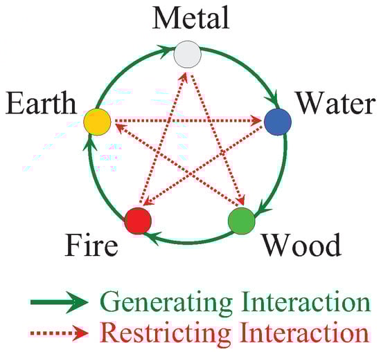 As shown in Figure 2, the outer circle represents the generating interaction: metal produces water, water produces wood, wood produces fire, fire produces earth and earth in its turn produces metal. The generating interaction is analogous to a mother-child relationship, which means children rely on their mother’s nutrition to grow and become strong. The inner circle represents the restricting interaction: wood inhibits earth, earth inhibits water, water inhibits fire, fire inhibits metal and metal in its turn inhibits wood. The restricting interaction as the same as the grandparent-grandchildren relationship, where the grandmother limits the development of grandchildren. Through the generation and restriction, all the elements are mutually restricted and promoted by each other, forming a dynamic equilibrium relationship.